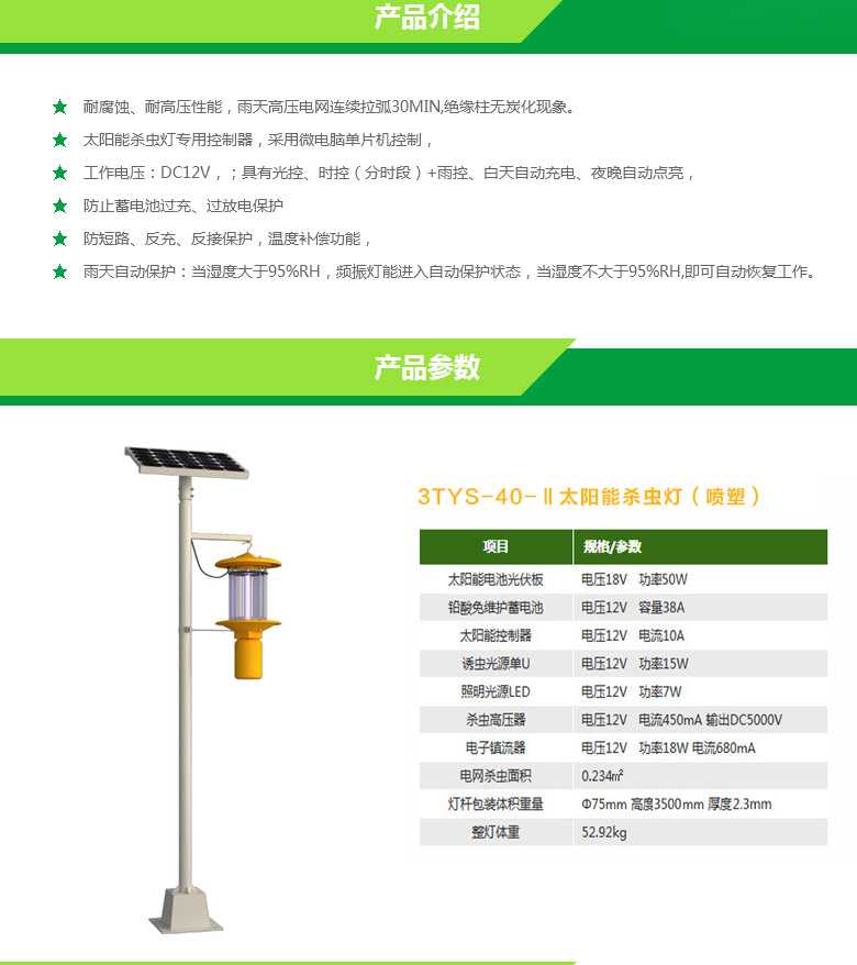天意新能源制造的自動清蟲殺蟲燈滅蟲效果好,可以誘殺森林害蟲,果樹害蟲,棉花害蟲,蔬菜害蟲,水稻害蟲,麥類害蟲,雜糧害蟲,倉儲害蟲,草原害蟲,地下害蟲等。殺蟲原理是利用害蟲趨光性進行誘殺的一種物理防治方法,利用害蟲較強的趨光、趨波、趨色、趨性信息的特性,將光的波長、波段、波的頻率設定在特定范圍內,近距離用光、遠距離用波,加以誘到的害蟲本身產生的性信息引誘成蟲撲燈,燈外配以電擊式高壓電網觸殺,使害蟲落入燈下的接蟲袋內,達到殺滅害蟲的目的。