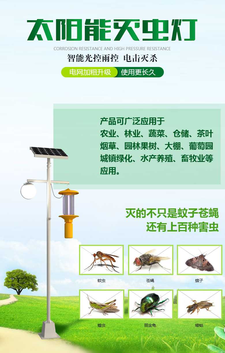 頻振式太陽能殺蟲照明一體燈具有光控、時控、雨控、過充、過放保護功能及微電腦自動保護系統。全天候,不怕水,耐高溫,防腐蝕,移動方便。園林公園,別墅群,庭院,藥材基地、蔬菜基地、茶園等場地使用。